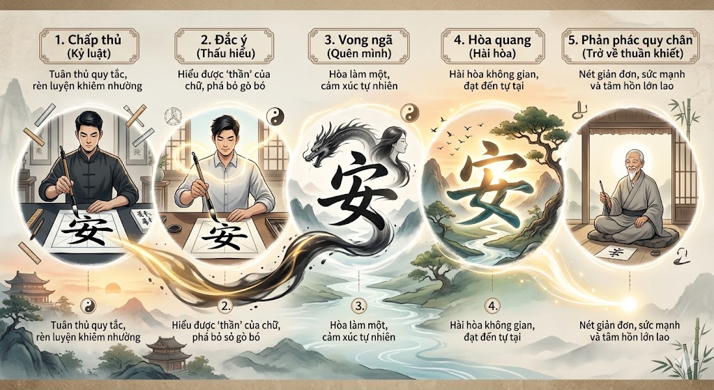 Chấp thủ (Kỷ luật): Giai đoạn đầu, người luyện phải tuân thủ nghiêm ngặt từng quy tắc, từng thứ tự nét. Đây là cách rèn luyện tính kỷ luật và sự khiêm nhường.
